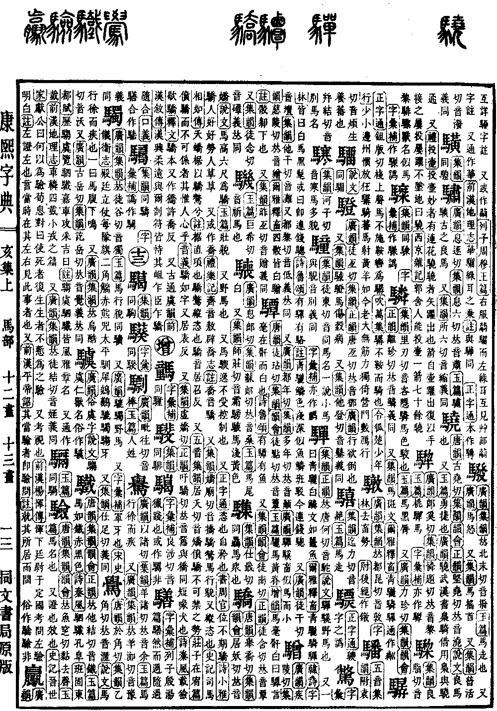 《唐韵》古尧切《集韵》《韵会》《正韵》坚尧切,𠀤音浇。《说文》良马也。 又《玉篇》勇捷也。《广韵》骁武,汉书,枭骑。借用枭,与骁通。 又《西京杂记》古之投壷取中而不求还,郭舍人则激矢令还,一矢百余反,谓之为骁。又《颜氏家训》汝南周璝、会𥡴徽,𠀤能一箭四十余骁。 *考证:〔《礼·投壷》投壷妙者,有连花骁。骁者,矢跃出也。箭自壷跃出,复以手接之,屡投屡跃不坠地,曰骁。《西京杂记》郭舍人能投壷,一箭七十余骁。〕 谨按投壷妙者云云壷篇无此语,所引西京杂记亦与原文不合,谨改为:西京杂记古之投壷取中而不求还,郭舍人则激矢令还,一矢百余反,谓之为骁。又颜氏家训汝南周璝会𥡴徽𠀤能一箭四十余骁。