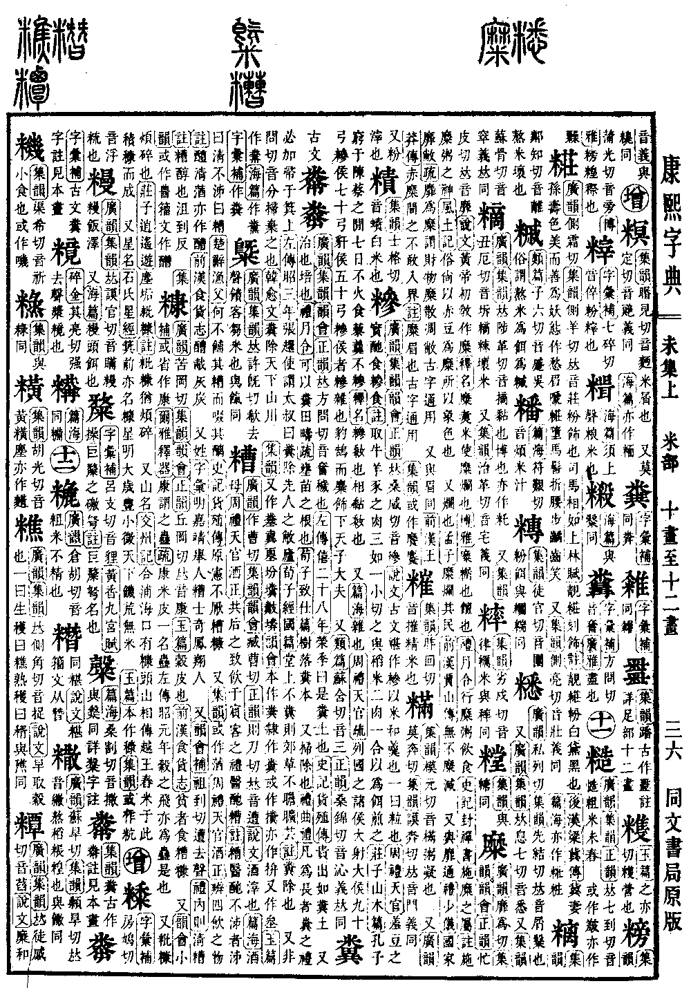 《广韵》苦冈切《集韵》《韵会》《正韵》丘冈切,𠀤音康。《玉篇》谷皮也。《前汉·食货志》贫者食糟糠。 又《韵会小补》或省作康。《尔雅·释器》康谓之蛊。《疏》康,米皮,一名蛊。《左传·昭元年》谷之飞亦为蛊是也。 又粃糠,烦碎也。《庄子·逍遥游》尘垢粃糠。《注》粃糠犹烦碎。 又山名。《交州记》合浦海口有糠头山,相传越王舂米于此,积糠而成。 又星名。《石氏·星经》箕前亦名糠。星明,大岁丰,小微,天下饥荒无米。 《玉篇》本作穅。《集韵》或作粇。