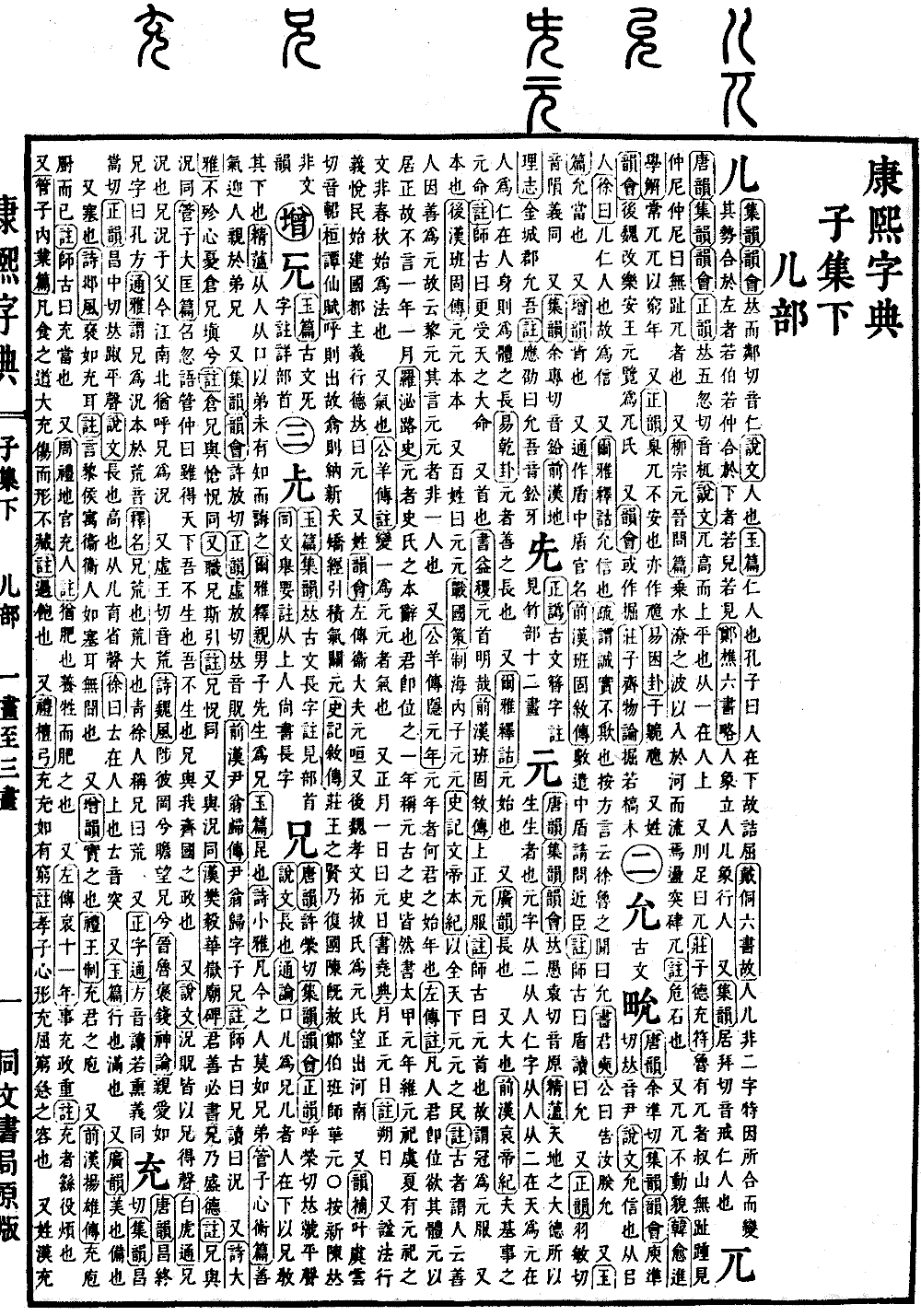 《唐韵》昌终切《集韵》昌嵩切《正韵》昌中切,𠀤踧平声。《说文》长也,高也。从儿,育省声。《徐曰》𠫓在人上也。𠫓音突。又《玉篇》行也,满也。又《广韵》美也,备也。又塞也。《诗·邶风》褎如充耳。《注》言黎侯寓衞,衞人如塞耳无闻也。又《增韵》实之也。《礼·王制》充君之庖。又《前汉·扬雄传》充庖厨而已。《注》师古曰:充,当也。又《周礼·地官·充人注》犹肥也,养牲而肥之也。又《左传·哀十一年》事充政重。《注》充者,䌛役烦也。又《管子·内业篇》凡食之道,大充,伤而形不藏。《注》过饱也。又《礼·檀弓》充充如有穷。《注》孝子心形,充屈穷急之容也。又姓。汉充向,充申。又《韵补》叶昌王切,厂平声。《道藏歌》渊响启灵扉,七门扇羽章。阳台大洞野,幽逸芝英充。充作〈𠫓下儿〉,𠒨𠒩等字从。以充代替。*《正字通》充字之譌。充字从𠫓从儿。