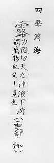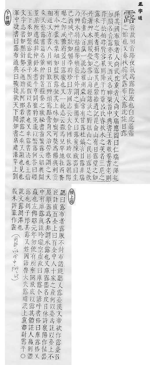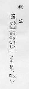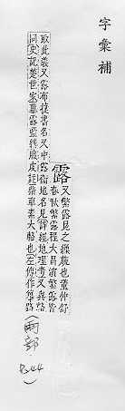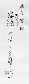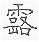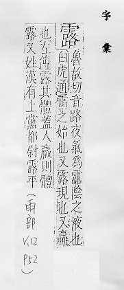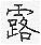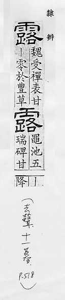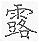 靠近地面的水蒸气,夜间遇冷凝结成的小水球:~水。白~。寒~。朝(zhāo )~。甘~。 在室外,无遮盖:~天。~宿。~营。 加入药料或果子汁制成的饮料或药剂:~酒。枇杷~。 滋润:覆~万民。 表现,显现:~布(a.通告;b.古代指未加封缄的文书;c.檄文;d.捷报等)。~骨。袒~。吐~。揭~。暴~。