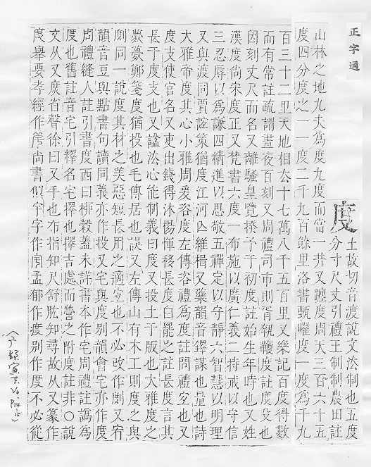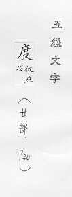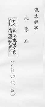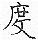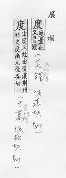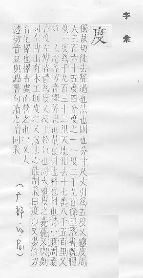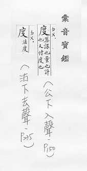 计算长短的器具或单位:尺~。刻~。~量衡。 事物所达到的境界:程~。高~。风~。 分角的单位,一圆周角分为360度:角~。 依照计算的一定标准划分的单位:温~。湿~。经~。纬~。浓~。 电能的单位,一千瓦小时电量的通称。 法则,应遵行的标准:制~。法~。 哲学上指一定事物保持自己质的数量界限。 能容受的量:气~。 考虑,打算:置之~外。 过,由此到彼:~日。~假。欢~新春。 量词,次:一~。再~。 僧尼道士劝人出家:剃~(剃发出家)。 姓。