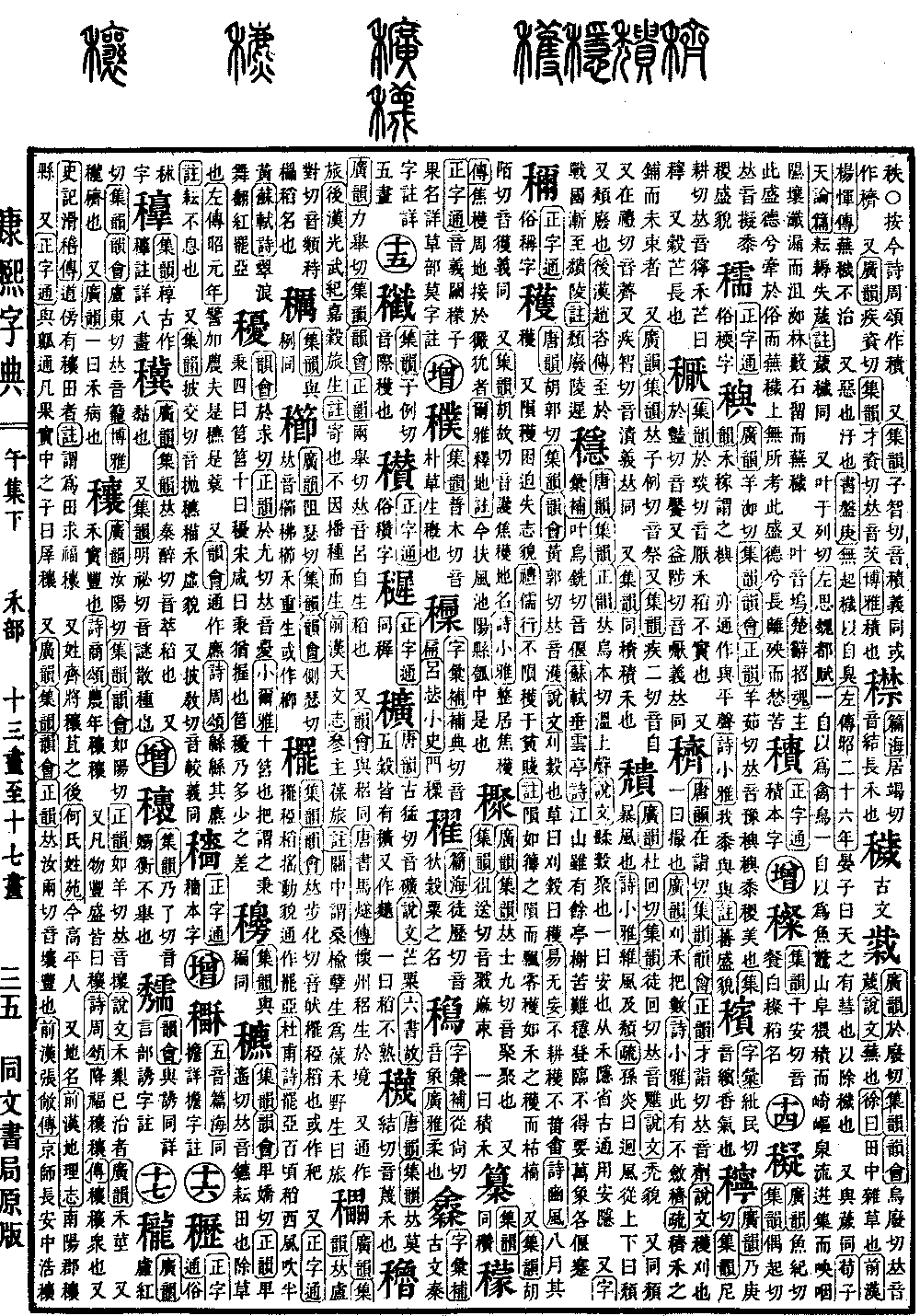 《广韵》汝阳切《集韵》《韵会》如阳切《正韵》如羊切,𠀤音攘。《说文》禾𥟜已治者。《广韵》禾茎。 又禾实丰也。《诗·商颂》丰年穰穰。 又凡物丰盛皆曰穰。《诗·周颂》降福穰穰。《传》穰穰,众也。又《史记·滑稽传》道傍有穰田者。《注》谓为田求福穰。 又姓。齐将穰苴之后。《何氏姓苑》今高平人。 又地名。《前汉·地理志》南阳郡穰县。 又《正字通》与瓤通。凡果实中之子曰屖穰。 又《广韵》《集韵》《韵会》《正韵》𠀤汝两切,音壤。丰也。《前汉·张敞传》京师长安中浩穰。 又《集韵》人成切,𩣘平声。蹂禾黍之余也。*考证:〔《诗·商颂》农年穰穰。〕 谨照原文农年改丰年。