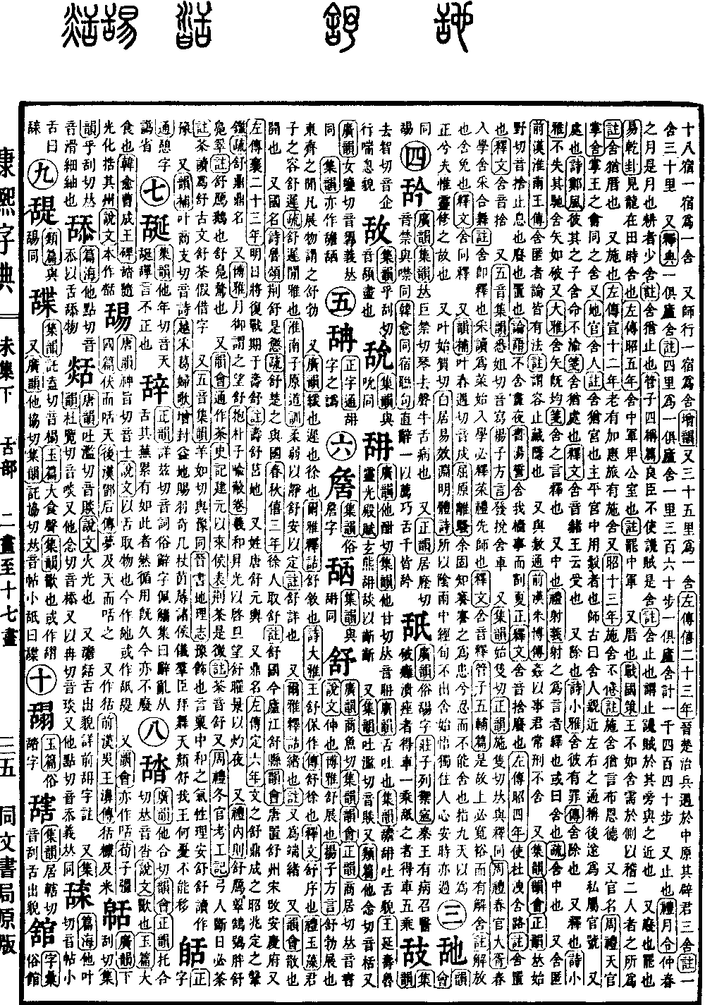 《广韵》商鱼切《集韵》《韵会》《正韵》商居切,𠀤音书。《说文》伸也。《博雅》舒,展也。《扬子·方言》舒,勃展也。东齐之闲凡展物谓之舒勃。 又《广韵》缓也,迟也,徐也。《尔雅·释诂》舒,叙也。《诗·大雅》王舒保作。《传》舒,徐也。《释文》舒,序也。《礼·玉藻》君子之容舒迟。《疏》舒迟,闲雅也。《淮南子·原道训》柔弱以静,舒安以定。《注》舒,详也。 又《尔雅·释诂》绪也。《注》又为端绪。 又《韵会》散也,开也。 又国名。《诗·鲁颂》荆舒是惩。《疏》舒,楚之与国。《春秋·僖三年》徐人取舒。《注》舒国,今庐江舒县。《韵会》唐置舒州,宋改安庆府。又《左传·襄二十三年》明日将复战,期于寿舒。《注》寿舒,莒地。 又姓。唐舒元兴。 又鼎名。《左传·定六年》文之舒鼎,成之昭兆,定之鞶鉴。《疏》舒鼎,鼎名。 又《博雅》月御谓之望舒。《抱朴子·喻蔽卷》羲和升光以启旦,望舒曜景以灼夜。 又《礼·内则》舒鴈翠,鹄鸮胖,舒凫翠。《注》舒鴈,鹅也。舒凫,鹜也。 又《韵会》通作荼。《史记·建元以来侯表》荆荼是征。《注》荼,音舒。又《周礼·冬官考工记》弓人斵目必荼。《注》荼,读为舒。古文舒荼假借字。 又《五音集韵》羊茹切。与豫同。《晋书·地理志》豫,饰也。言禀中和之气,性理安舒。舒读作豫。 又《韵补》叶商支切,音诗。《越采葛妇歌》增封益地赐羽奇,几杖茵蓐诸侯仪。羣臣拜舞天颜舒,我王何忧不能移。*考证:〔《周礼·冬官考工记》弓人断日必荼。〕 谨照原文断日改斵目。〔《五音集韵》羊如切。与豫同。〕 谨照原文羊如切改羊茹切。