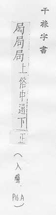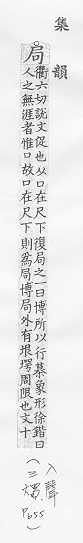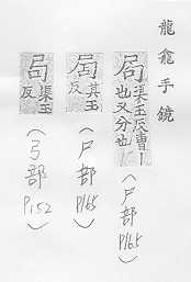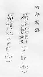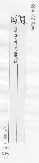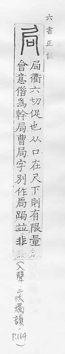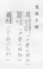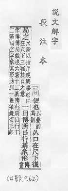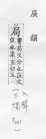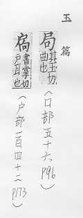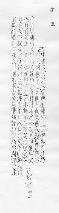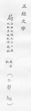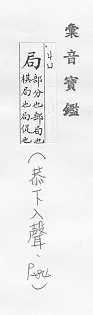 部分:~部。~麻(局部麻醉)。 机关及团体组织分工办事的单位:教育~。 某些商店的名称:书~。 棋盘:棋~。 下棋或其他比赛进行一次:下了一~棋。 着棋的形势,喻事情的形势、情况:时~。大~。~面。~势。 弯曲。 骗人的圈套:骗~。 畏缩不安,狭隘,不舒展:~促。~限。 人的器量:~量(liáng)。器~。~度(dù)。 某些聚会:饭~。饮~。赌~。