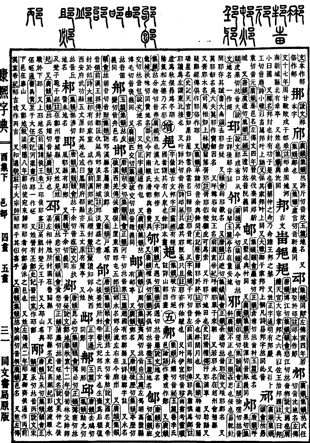 〔古文〕𤰫𨚚邫《唐韵》博江切《集韵》《韵会》悲江切,𠀤音梆。《说文》国也。《周礼·天官》大宰掌邦之六典,以佐王治邦国。《注》大曰邦,小曰国。 又《释名》邦,封也。封有功于是也。《书·蔡仲之命》乃命诸王邦之蔡。 又姓。《正字通》明有邦严。 又叶卜工切,音崩。《诗·小雅》以畜万邦,叶上讻。《又》保其家邦。叶上同。又《大雅》御于家邦。叶上恫,凡《诗》《易》邦字𠀤同此音。