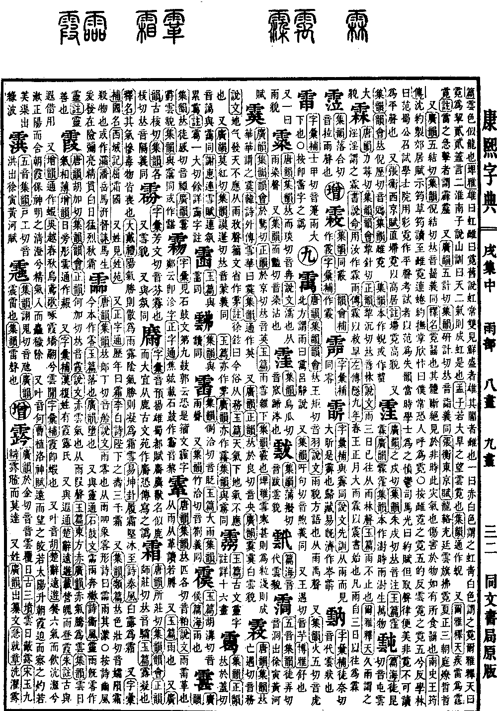 《唐韵》胡加切《集韵》《韵会》《正韵》何加切,𠀤音霞。《说文》赤云气也。从雨叚声。《玉篇》东方赤。《广韵》赤气腾为云。《集韵》云日气相薄。《增韵》日旁彤云。通作赮。 又《字汇补》汉复姓有霞露氏。 又与遐通。《楚辞·远游》载营魄而登霞。《朱注》古与遐借用。 又《增韵》通作虾。《吴越春秋·乌鸢歌》啄霞矫翮兮云闲。《字汇补》霞即虾也。 又叶音胡。《楚辞·远游》餐六气而飮沆瀣兮,漱正阳而含朝霞。保神明之淸澄兮,精气入而麤秽除。 又叶音何。《曹植·洛神赋》远而望之,皎若太阳升朝霞。迫而察之,灼若芙渠出绿波。