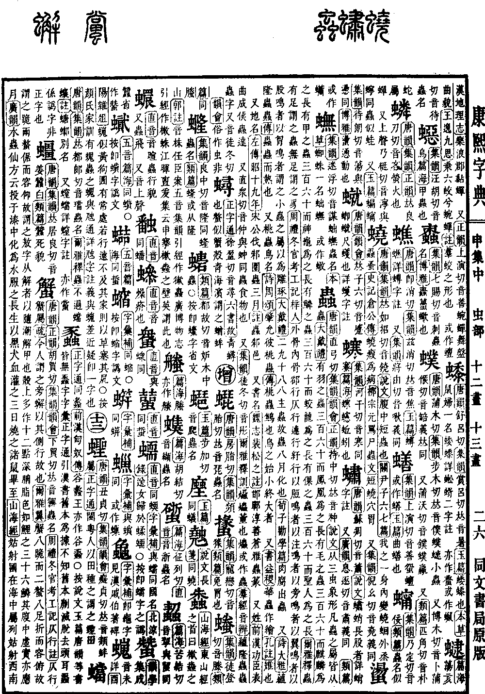 《唐韵》《正韵》胡买切《集韵》《韵会》下买切,𠀤音獬。虫名。《周礼·冬官考工记·仄行注》仄行,蟹属。《疏》今人谓之旁蠏,以其侧行故也。《尔雅翼》蟹八跪而二螯,八足折而容俯,故谓之跪,两螯倨而容仰,故谓之敖,字从解者,以随潮解甲也。壳上多作十二点深胭脂色,如鲤之三十六鳞。其腹中虚实亦应月。《广韵》水虫。仙方云:投于漆中化为水,服之长生,以黑犬血灌之,三日烧之,诸䑕毕至。《山海经》姑射国在海中,属列姑射,西南山环之,大蟹在海中。《注》盖千里之蟹也。余互详蝤蟧螖等字注。 《集韵》通作䲒。