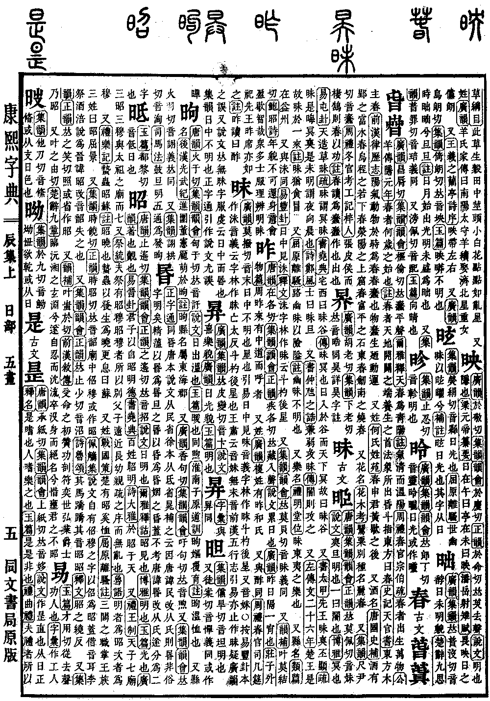 《唐韵》止遥切《集韵》《韵会》《正韵》之遥切,𠀤音招。《说文》日明也。《尔雅·释诂》昭,见也。《博雅》明也。《玉篇》光也。《广韵》著也,觌也。《易·晋卦》君子以自昭明德。《书·尧典》百姓昭明。《诗·大雅》于昭于天。 又《礼·王制》天子七庙,三昭三穆与太祖之庙而七。又《祭统》夫祭有昭穆。昭穆者,所以别父子、远近、长幼、亲疏之序而无乱也。《鲁语》明者为昭,次者为穆。 又《礼·乐记》蛰虫昭苏。《注》昭,晓也。蛰虫以发生为晓,更息曰苏。 又姓。《战国策》楚有昭奚恤。《屈原·离骚注》三闾之职,掌王族三姓,曰:昭、屈、景。 又《集韵》时饶切《正韵》时昭切,𠀤音韶。庙中佋穆,或作昭。《佩觽集》说文自有佋穆之字,以佋为昭,盖借音耳。李祭酒涪说为晋讳昭,改音韶,失之也。 又《集韵》《韵会》《正韵》𠀤止少切,音沼。《诗·鲁颂》其马𫏋𫏋,其音昭昭。《释文》昭,之绕反。 又《集韵》《正韵》𠀤之笑切。照,或省作昭。 又《韵补》叶蚩于切。《前汉·叙传》受命之初,赞功剖符。奕世弘业,爵土乃昭。 又叶之由切。《楚辞·九章》临沅湘之𤣥渊兮,遂自忍而沈流。卒没身而绝名兮,惜壅君之不昭。*考证:〔爵士乃昭。〕 谨照前汉敍传原文,爵士改爵土。