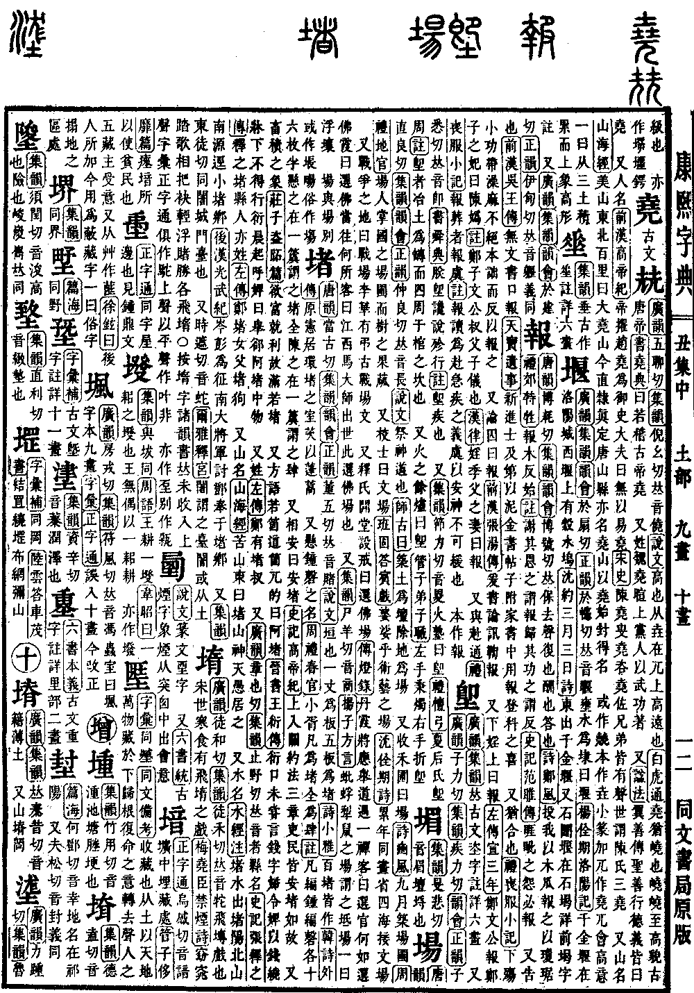 《广韵》《集韵》𠀤古文垐字。注详六画。 又《广韵》子力切《集韵》疾力切《韵会》《正韵》子悉切,𠀤音即。《书·舜典》朕堲谗说殄行。《注》堲,疾也。 又《集韵》节力切,音畟。火熟曰堲。《礼·檀弓》夏后氏堲周。《注》堲者,冶土为𦉊,而四周于棺之坎也。 又火之余烬曰堲。《管子·弟子职》左手秉烛,右手折堲。堲字原刻上从即。*考证:〔《集韵》节力切,音畟。火塾曰堲。〕 谨照原文火塾改火熟。