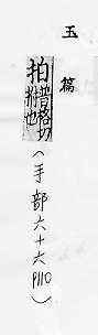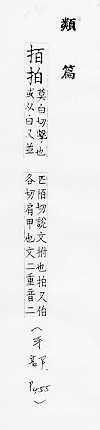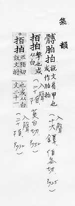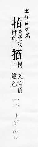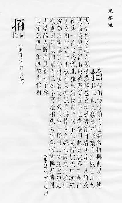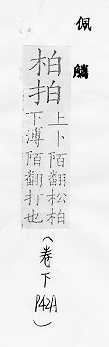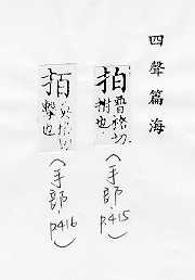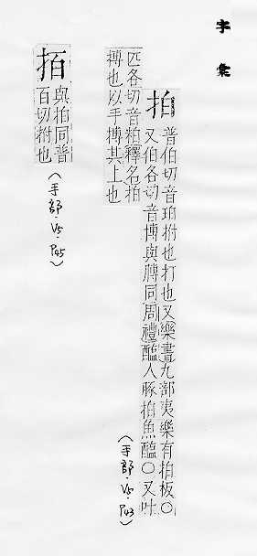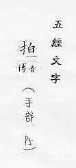 用手掌打:~击。~掌。~抚。~案叫绝。 浪涛冲击:~岸。 拍打东西的用具:~子(亦是计算乐音长短的单位)。 乐曲的节奏:~节。 摄影:~摄。~照。~片子。 发出:~发。~电报。 阿谀,巴结:~马屁。吹吹~~。