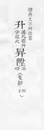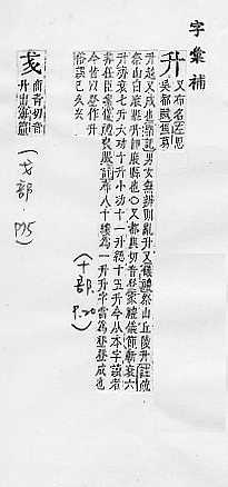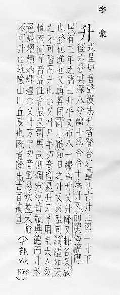 容量单位。 量粮食的器具。 向上,高起,提高:~力(亦称“举力”)。~格。~华(a.固态物质直接变为气;b.喻事物的提高和精炼)。~迁。~值。~堂入室(喻人的学问造诣由浅入深,循序渐进,达到精深)。晋~。提~。