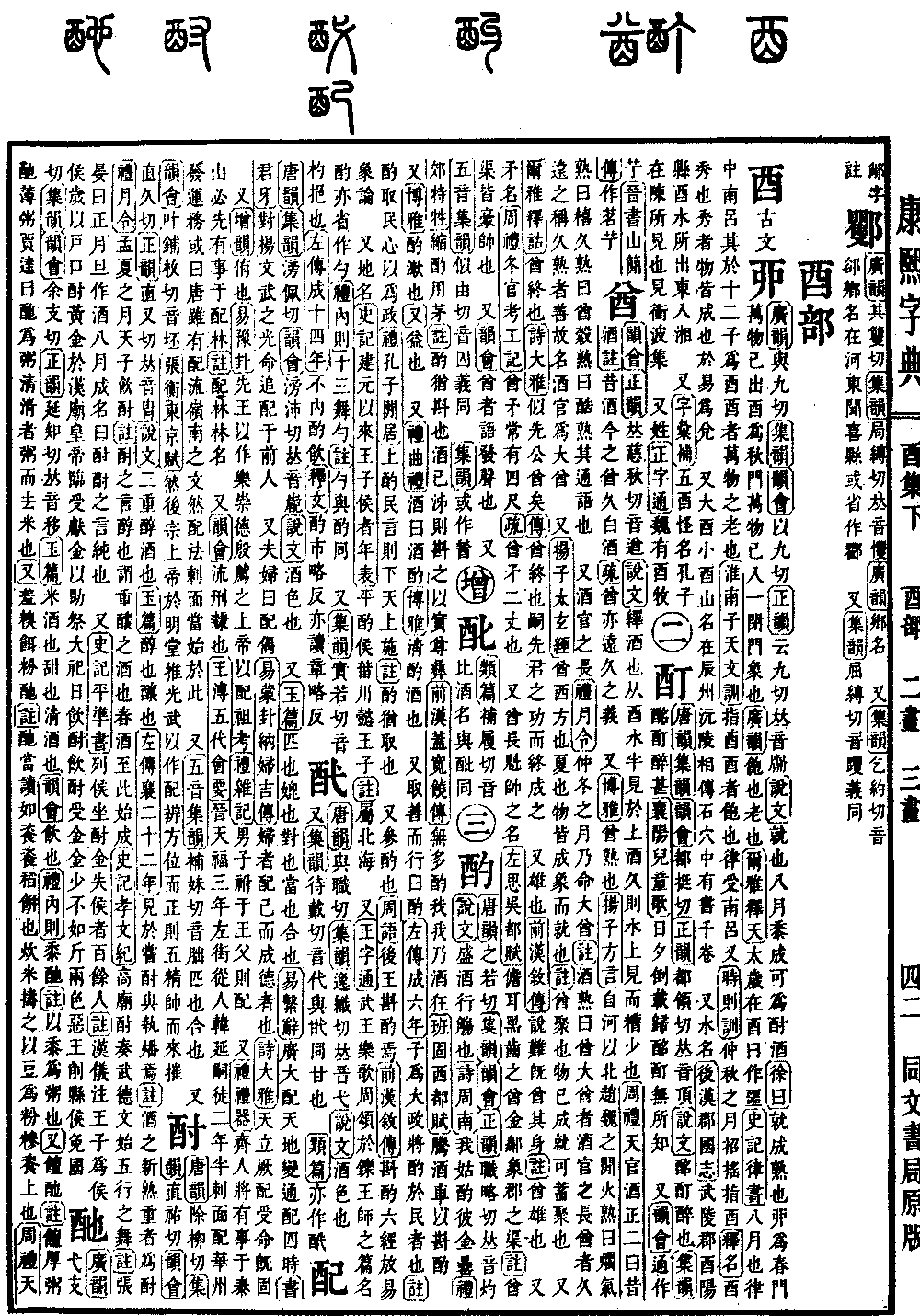 《唐韵》《集韵》滂佩切《韵会》滂沛切,𠀤音嶏。《说文》酒色也。 又《玉篇》匹也,媲也,对也,当也,合也。《易·系辞》广大配天地,变通配四时。《书·君牙》对扬文武之光命追配于前人。 又夫妇曰配偶。《易·蒙卦·纳妇吉传》妇者,配己而成德者也。《诗·大雅》天立厥配,受命既固。 又《增韵》侑也。《易·豫卦》先王以作乐崇德殷荐之上帝,以配祖考。《礼·杂记》男子祔于王父则配。 又《礼·礼器》齐人将有事于泰山,必先有事于配林。《注》配林,林名。 又《韵会》流𠛬隶也。《王溥·五代会要》晋天福三年,左街从人韩延嗣徒二年半,刺面,配华州,发运务。或曰唐虽有配流岭南之文,然配法刺面,当始于此。 又《五音集韵》补妹切,音朏。匹也,合也。 又《韵会》叶铺枚切,音坯。《张衡·东京赋》然后宗上帝于明堂,推光武以作配。辨方位而正则,五精帅而来摧。