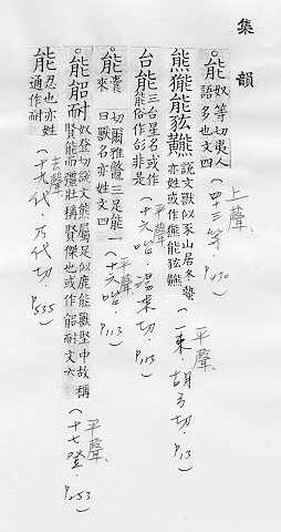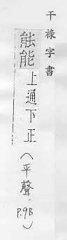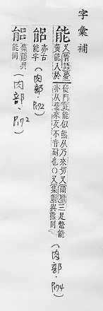 才干,本事:~力。~耐。才~。 有才干的:~人。~手。贤~。~工巧匠。~者为师。 胜任,善于:~够。~柔~刚。力所~及。欲罢不~。~动。 会(表示可能性):小弟弟~走路了。 应该:你不~这样说他。 物理学名词,“能量”的简称:电~。热~。 和睦:“(萧)何素不与曹参相~”。 传说中的一种兽,似熊。 古代称一种三足鳖。