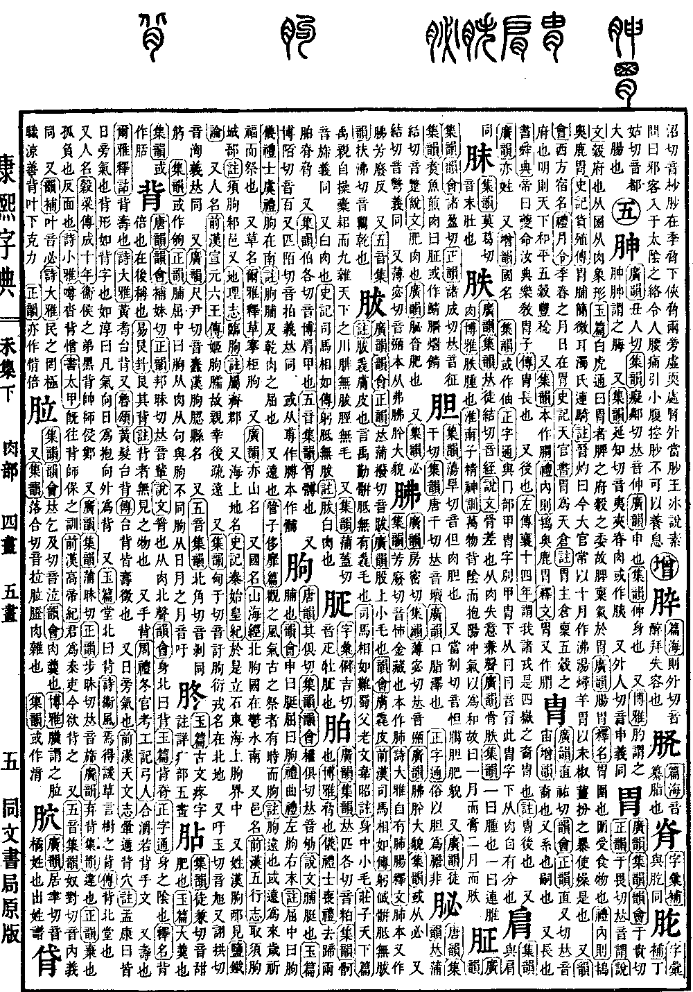 《广韵》《集韵》《韵会》于贵切《正韵》于畏切,𠀤音谓。《说文》谷府也。从𡇒从肉,象形。《玉篇》白虎通曰:胃者,脾之府,谷之委,故脾禀气于胃。《广韵》肠胃。《释名》胃,围也,围受食物也。《礼·内则》鸨奥鹿胃。《史记·货殖传》胃脯𥳑微耳,浊氏连骑。《注》晋灼曰:今大官常以十月作沸汤,燖羊胃,以末椒姜扮之,暴使燥,是也。 又《韵会》西方宿名。《礼·月令》季春之月,日在胃。《史记·天官书》胃为天仓。《注》胃主仓禀,五谷之府也。明则天下和平,五谷丰稔。 又《集韵》本作𦝩。《礼·内则》鸨奥鹿胃。《释文》胃又作𦝩。又𦞅。