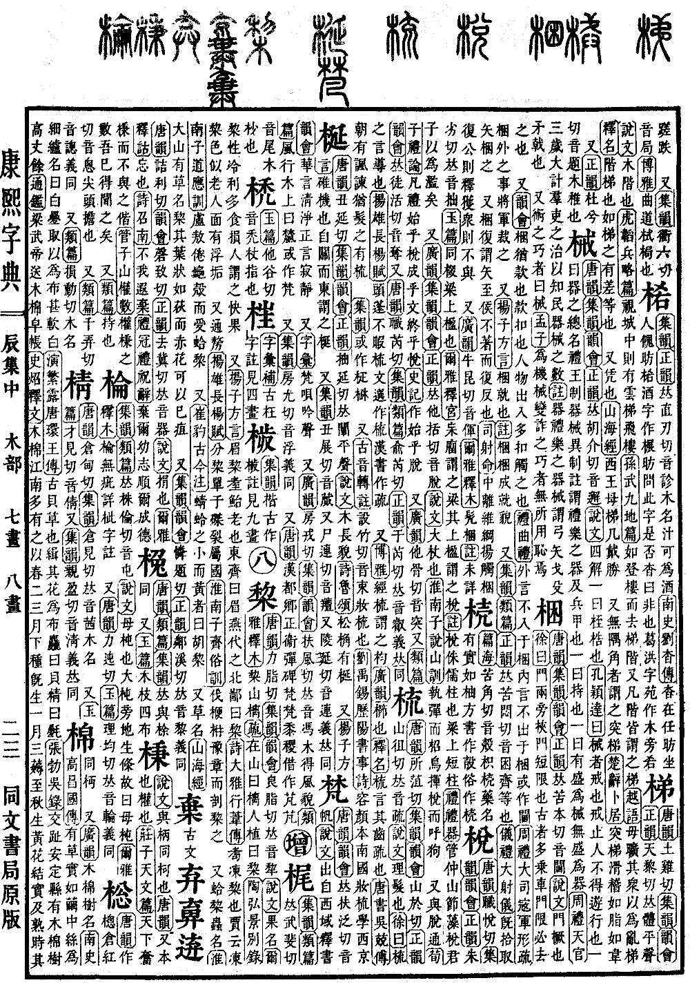 《唐韵》土鸡切《集韵》《韵会》《正韵》天黎切,𠀤体平声。《说文》木阶也。《虎韬·兵略篇》视城中,则有云梯飞楼。《孙武·九地篇》如登楼而去梯阶。又凡阶皆谓之梯。《越语》毋旷其众,以为乱梯。《释名》阶梯也。如梯之有差等也。 又凭也。《山海经》西王母梯几戴胜。 又无隅角者谓之突梯。《楚辞·卜居》突梯滑稽,如脂如韦。 又《正韵》杜兮切,音题。木稚也。