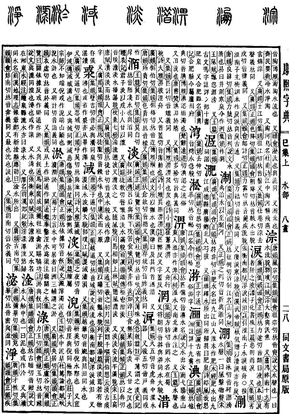 《广韵》《正韵》徒览切《集韵》《韵会》杜览切,𠀤音啖。《说文》薄味也。《急就篇注》平薄谓之淡。《史记·叔孙通传》吕后与陛下攻苦食啖。《注》啖,亦作淡。《如淳曰》食无菜茹为淡。 又甘之反也。《礼·表记》君子淡以成,小人甘以坏。 又《广韵》徒敢切,音噉。淊淡,水满貌。《前汉·扬雄传》秬鬯泔淡。 又《广韵》《集韵》《正韵》𠀤以冉切,音琰。澹淡,水播荡貌。《枚乗·七发》湍流溯波,又澹淡之。 又随风貌。《司马相如·上林赋》随风澹淡。 又淡淡,安流平满貌。《宋玉·高唐赋》溃淡淡而𠀤入。 又《广韵》《集韵》𠀤徒甘切,音谈。水貌也。或作澹。 又与痰通。《王羲之·初月帖》淡闷千呕。《黄伯思云》淡,古痰字。 又《广韵》《集韵》《韵会》《正韵》𠀤徒滥切,音餤。水味也。《中庸》淡而不厌。 又《集韵》以赡切,音艳。水貌。《列子·汤问篇》淡淡焉若有物存。张湛读。*考证:〔《列子·殷汤篇》淡淡焉若有物存。〕 谨照原书改汤问篇。