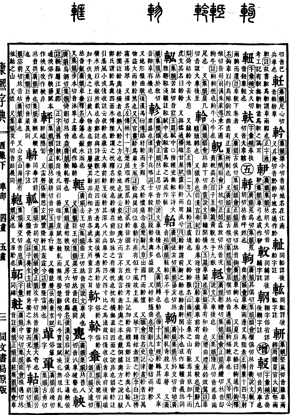《集韵》《韵会》《正韵》𠀤止忍切,音胗。《说文》车后横木也。 又《广韵》转也,动也。《扬子·太𤣥经》轸转其道。 又车众盛也。《淮南子·兵略训》士卒殷轸。《注》殷轸,乗舆多盛貌。 又纡轸,隐曲也。《楚辞·九章》心郁结而纡轸。又地形盘曲貌。《后汉·冯衍传》路纡轸而多艰。 又轸怀,痛念也。《楚辞·九章》出国门而轸怀。 又《韵会》宿名。《史记·律书》轸者,言万物益大而轸轸然也。又《天官书》轸为车,主风。《注》轸与巽同位,车动行疾有似于风,故主风。 又琴下转絃者谓之轸。《李白诗》拂霜弄瑶琴。 又国名。《左传·桓十一年》楚屈瑕将盟贰、轸。《注》贰、轸皆国名。 又姓。○按《考工记》加轸与轐焉。郑注云:轸,舆也。《轮人》轸围注:轸,舆后横者也。《辀人》轸之方也,以象地也。疏云:象地以舆方而言,不言舆言轸者,轸,舆之本也。戴侗据舆方之说以驳郑氏,谓轸为舆四面木。《博雅》轸谓之枕,《释名》轸,枕也。轸横在前如卧牀之有横枕也。枕有横无直,则四面之说非也。《韵会》轸注引《秦风·小戎》俴收注云:收,轸也。疏云:大车前轸至后轸其深八尺,兵车之轸四尺四寸,比之为浅,故曰俴收。收者,车前后两端横木所以收敛所载也。合郑注与《诗》疏观之,则是四面方者为舆,前后横者为轸,皆加于伏兔之上以载人物者也。郑注屡变其辞,非自相矛盾,各就本文所重言之耳。