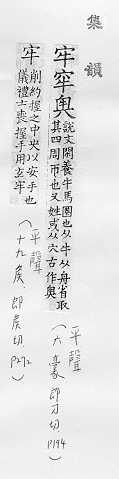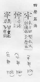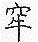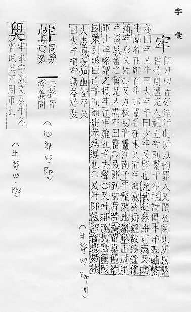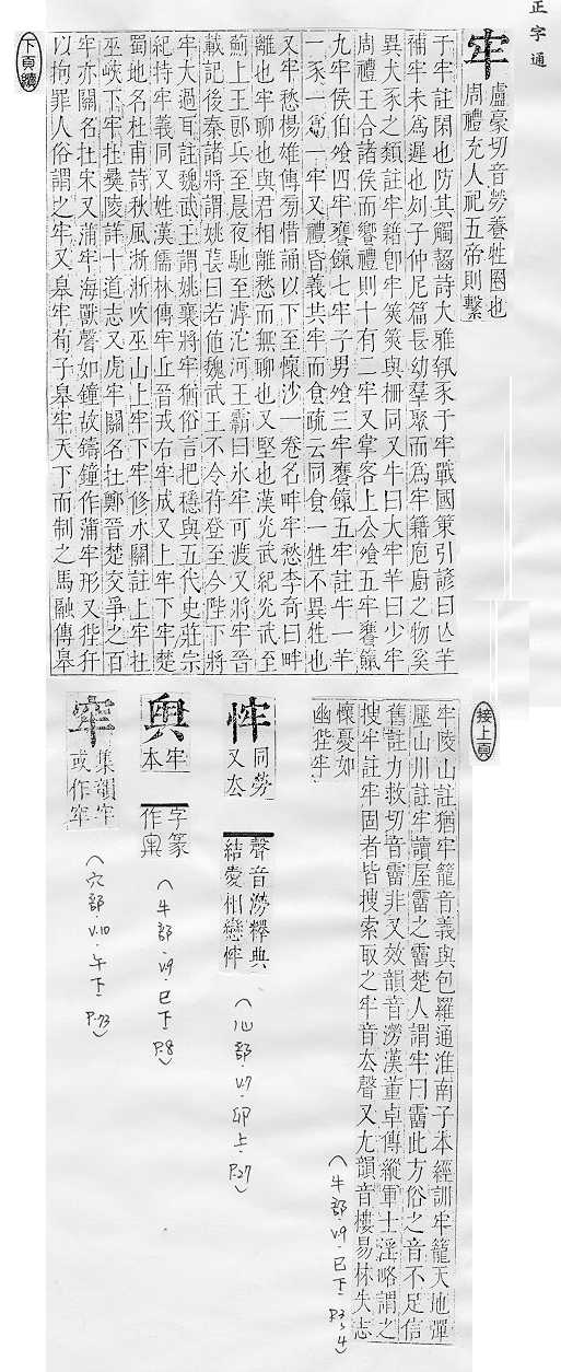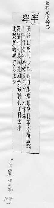 养牲畜的圈(juàn ):虎~。亡羊补~(喻事后补救还不为迟)。~笼。 古代称作祭品的牲畜:太~(古代帝王、诸侯祭祀社稷时,牛、羊、豕三牲全备之称)。少~(诸侯宗庙,用羊、豕之称)。 监禁犯人的地方:监~。坐~。 结实,坚固,固定:~固。~稳(a.稳妥可靠;b.物体稳定,不摇晃)。~记。~不可破。