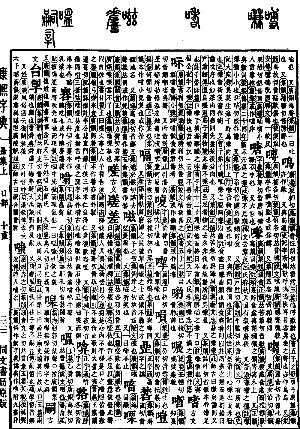 〔古文〕𨲠差《广韵》《集韵》《韵会》《正韵》𠀤咨邪切,音罝。《玉篇》嗟叹也。《广韵》咨也。《集韵》一曰痛惜也。《尔雅·释诂》嗟,𨲠也。《释名》嗟,佐也。言不足以尽意,故发此声以自佐也。《书·甘誓》王曰:嗟六事之人,予誓告汝。《诗·周南》嗟我怀人。又《齐风》猗嗟昌兮。《疏》猗是心内不平,嗟是口之喑咀,皆伤叹之声。《礼·檀弓》嗟来食。《广韵》同𧨁。《集韵》本作𧪰,亦书作𧪘。 又《集韵》遭哥切,音䦈。《易·离卦》不鼓缶而歌,则大耋之嗟。《音义》王肃读遭哥切《阮籍·咏怀诗》李公悲东门,苏子狭三河。求仁自得仁,岂复叹咨嗟。 又《韵会补》子夜切,音借。同唶。《三苍诂》咄嗟,易度也。犹言呼吸之闲。字本作唶。古有咄唶歌。世说石崇作豆粥,咄嗟而办。