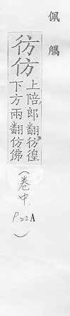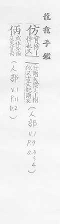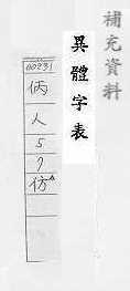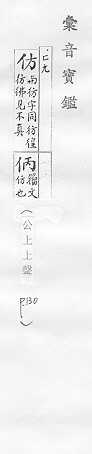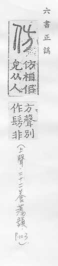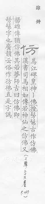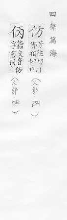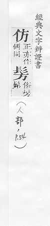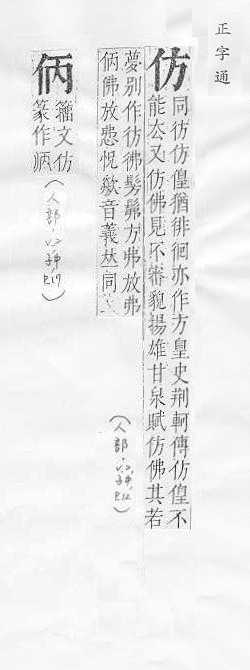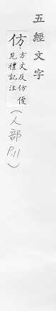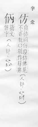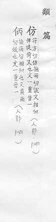 效法,照样做:~效。~古。~冒。~宋(印刷字体的一种,亦称“仿宋体”)。 依照范本写的字:~影。~书。 相似,好像:~像(仿佛相似)。~佛(fú)。二者相~。