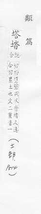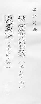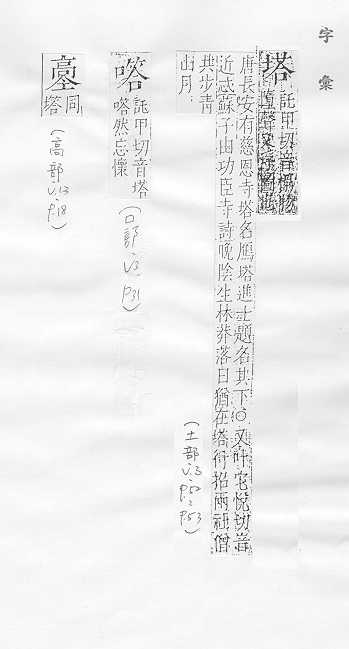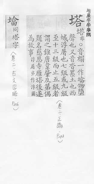佛教特有的高耸的建筑物,尖顶,多层,常有七级、九级、十三级等,形状有圆形的、多角形的,一般用以藏舍利、经卷等:宝~。佛~。 像塔形的建筑物或器物:水~。灯~。纪念~。金字~。~楼。 姓。===汉英互译===