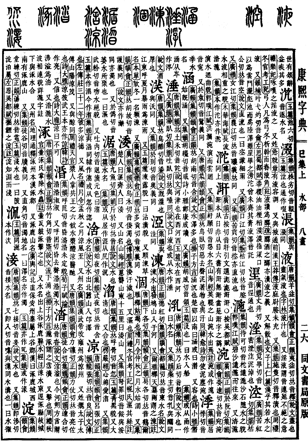 《唐韵》羊益切《集韵》《韵会》《正韵》夷益切,𠀤音绎。《说文》𧗁也,𧗁气液也。《字林》液,汁也。 又淫液,谓音连延不绝之意。《礼·乐记》咏叹之,淫液之。 又姓。《急就篇》有液容调。 又与掖通。《前汉·王莽传》液庭尉媵未充。 又《集韵》施只切。音释。渍也。《周礼·冬官考工记》弓人凡为弓,冬析干而春液角。《注》液读为醳。《疏》醳酒之醳,亦渍液之义。 又解散也。《文子·上仁篇》涣乎其若水之液。 又《韵补》叶弋灼切,音龠。《左思·蜀都赋》黍稷油油,稉稻漠漠。指渠口以为云门,洒彪池而为陆泽。虽星毕之滂沱,曾未齐其膏液。泽音托。*考证:〔《说文》尽也,尽气液也。〕 谨照二尽字皆𧗁字之譌𧗁气液也见说文血部两尽字𠀤改𧗁。