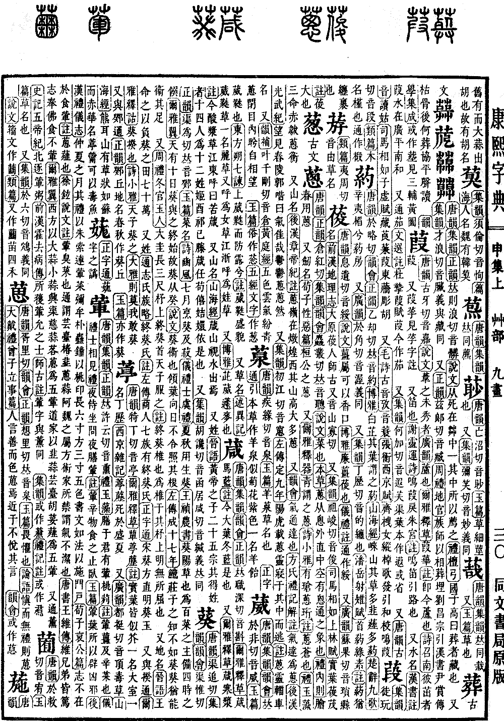 〔古文〕葱《唐韵》《正韵》仓红切《集韵》《韵会》麤丛切,𠀤音聪。《说文》菜也。《本草》葱从悤,外直中空,有悤通之象也。《礼·内则》脍春用葱。 又劒名。《荀子·性恶篇》桓公之葱。 又《尔雅·释器》靑谓之葱。《诗·小雅》有玱葱珩。《注》葱,苍也。《礼·玉藻》三命赤韨葱衡。 又山名。《后汉·章帝纪注》葱岭,在炖煌西,其山高大多葱。 又《韵会》气通达也。《方氏礼记解注》气达为葱。《后汉·光武纪》望见舂陵,郭唶曰:气佳哉,郁郁葱葱然。 又《集韵》初江切,音窻。《左传·定九年》阳虎载葱灵,寝于其中而逃。《注》葱灵,辎车名。 又《韵补》叶千刚切,音仓。《黄庭经》五色云气纷靑葱,闭目内𦕎自相望。 《玉篇》俗作䓗。《五经文字》作葱。*(葱)《集韵》葱古作葱。注详九画。