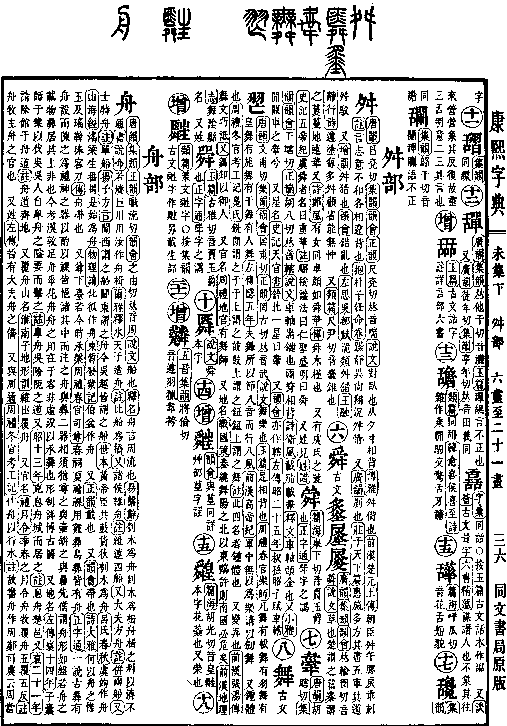 〔古文〕𦐀《唐韵》文甫切《集韵》《韵会》罔甫切《正韵》罔古切,𠀤音武。《说文》舞乐也。《玉篇》足相背也。《周礼·春官·乐师》凡舞,有帗舞,有羽舞,有皇舞,有旄舞,有干舞,有人舞。《左传·隐五年》夫舞,所以节八音而行八风。《前汉·高帝纪》军中无以为乐,请以劒舞。 又钟体也。《周礼·冬官考工记·凫氏》铣闲谓之于,于上谓之鼓,鼓上谓之钲,钲上谓之舞。《注》此四名者,钟体也。 又变弄也。《前汉·张汤传》舞文巧诋。《又》舞知以御人。 又官名。《周礼·地官》有舞师。 又地名。《战国策》秦绕舞阳之北,以东临许,则南国必危矣。《前汉·地理志》舞隂,县名。 又姓。