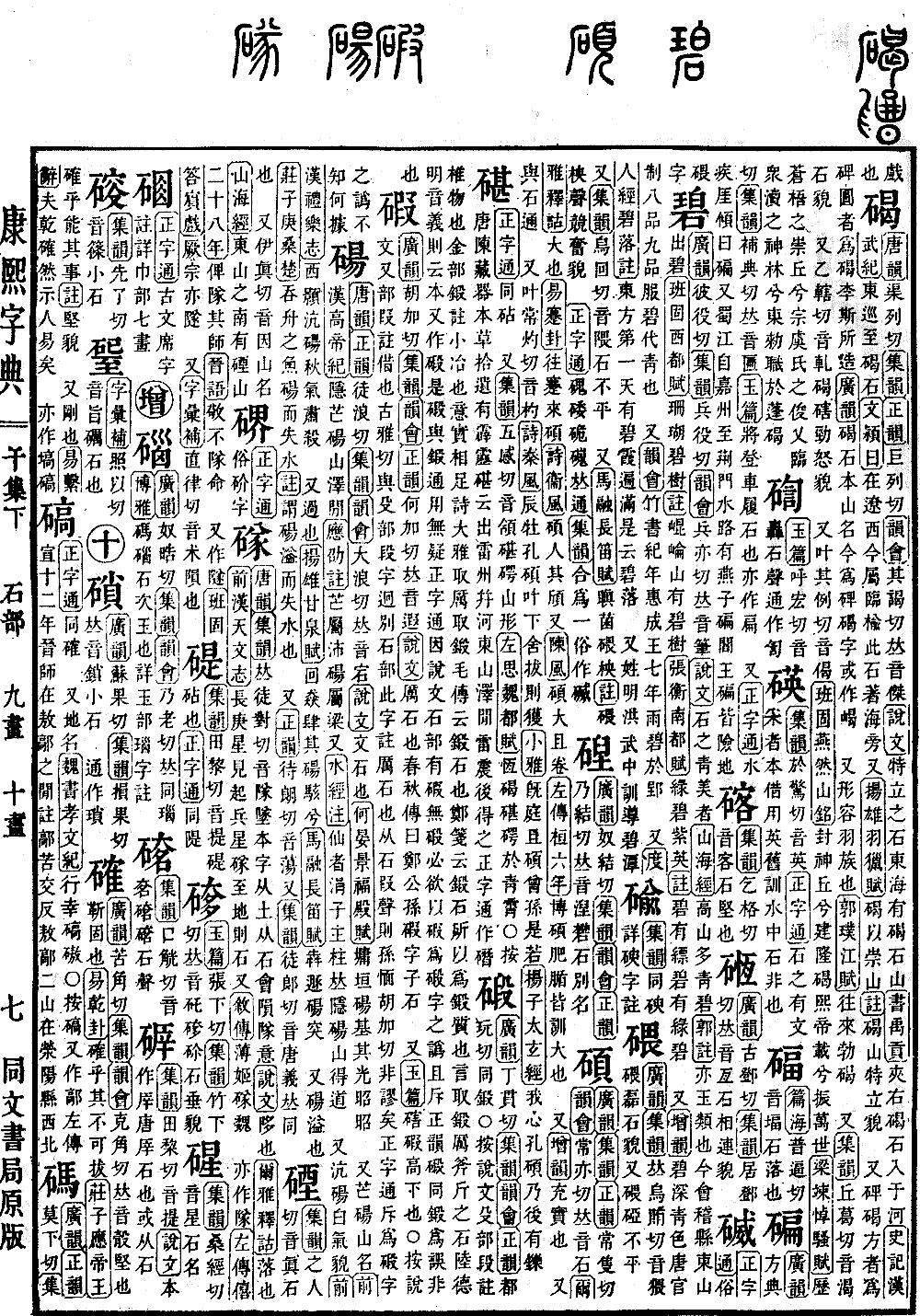 《唐韵》《正韵》徒浪切《集韵》《韵会》大浪切,𠀤音宕。《说文》文石也。《何晏·景福殿赋》墉垣砀基,其光昭昭。 又芒砀,山名。《前汉·高帝纪》隐芒砀山泽闲。《应劭注》芒属沛,砀属梁。又《水经注》仙者涓子,主柱,𠀤隐砀山,得道。 又沆砀,白气貌。《前汉礼乐志》西颢沆砀,秋气萧杀。 又过也。《扬雄·甘泉赋》回猋肆其砀骇兮。《马融·长笛赋》犇遯砀突。 又砀,溢也。《庄子·庚桑楚》吞舟之鱼,砀而失水。《注》谓砀溢而失水也。 又《正韵》待朗切,音荡。又《集韵》徒郞切,音唐。义𠀤同。