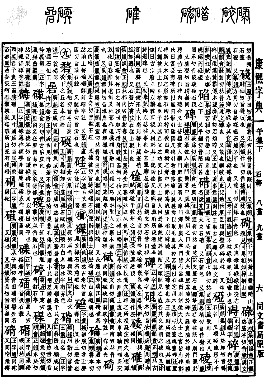 《唐韵》《集韵》《韵会》《正韵》𠀤卢谷切,音禄。《说文》石貌。 又《集韵》力角切,音荦。碌䃚,石地不平也。 又龙玉切,音录。石靑色。 又与录通。碌碌,随从之貌。《史记·酷吏传赞》九卿碌碌奉其官。《论语注》碌碌,庸人。 又《老子·道德经》不欲碌碌如玉。《注》喩少也。