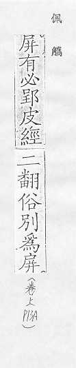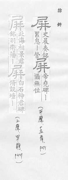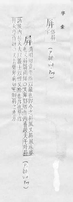 遮挡:~风。~障。~蔽。~藩(“屏风”和“藩篱”,喻卫国的重臣)。~翰(喻卫国的重臣)。 字画的条幅,通常以四幅或八幅为一组:画~。四扇~。