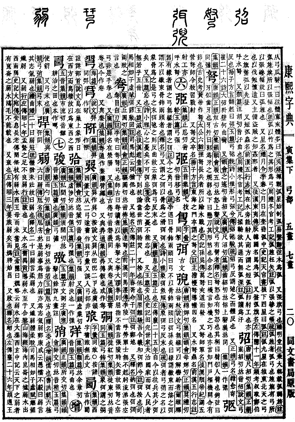 《唐韵》而勺切《集韵》《韵会》日灼切,𠀤音若。《玉篇》尫劣也。《释名》委也。《增韵》懦也。《书·洪范》六极,六曰弱。《传》尫劣。《疏》尫劣𠀤是弱事,为筋力弱,亦为志气弱。郑康成云:愚懦不毅曰弱,言其志气弱也。《礼·曲礼》二十曰弱冠。《疏》体犹未壮,故曰弱也。《释名》二十曰弱,言柔弱也。 又孅弱,体柔貌。《司马相如·子虚赋》妩媚孅弱。 又弱行。《左传·昭七年》孟絷之足,不良弱行。《注》跛也。 又水名。《书·禹贡》导弱水至于合黎。《山海经》海内昆仑之墟,弱水出西南隅。《史记·大宛传》安息长老传闻条枝有弱水西王母而未尝见。《注》索隐曰:魏略云弱水在大秦西。𤣥中记云:天下之弱者,有昆仑之弱水,鸿毛不能载也。 又衰也。《左传·昭三年》姜族弱矣。而妫将始昌。 又败也。《释名》衂也。《左传·襄二十六年》颉遇王子弱焉。《注》弱,败也。言为王子所得。 又丧也。《左传·昭三年》又弱一个焉。 又繁弱,弓名。亦作蕃弱。《左传·定四年》封父之繁弱。《注》繁弱,大弓名。《孔丛子·公孙龙篇》楚王张繁弱之弓。《司马相如·子虚赋》弯蕃弱。《注》文颖曰:蕃弱,夏后氏之良弓名。 《说文》本作𢐅。