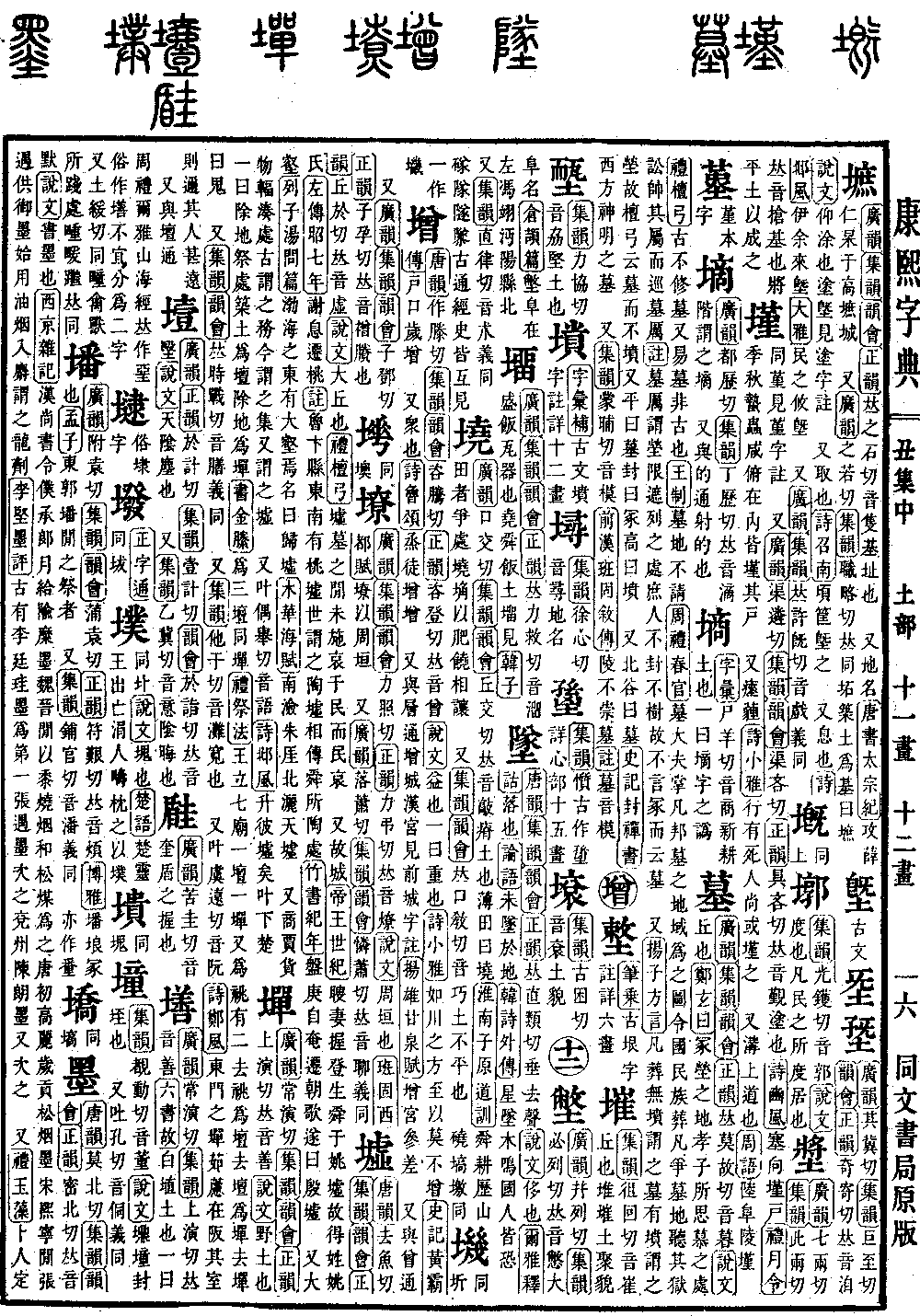 《唐韵》去鱼切《集韵》《韵会》《正韵》丘于切,𠀤音虚。《说文》大丘也。《礼·檀弓》墟墓之闲,未施哀于民而民哀。 又故城。《帝王世纪》瞍妻握登生舜于姚墟,故得姓姚氏。《左传·昭七年》谢息迁桃。《注》鲁卞县东南有桃墟,世谓之陶墟,相传舜所陶处。《竹书纪年》盘庚自奄迁朝歌,遂曰殷墟。 又大壑。《列子·汤问篇》渤海之东有大壑焉,名曰归墟。《木华·海赋》南澰朱厓,北洒天墟。 又商贾货物辐凑处,古谓之务,今谓之集,又谓之墟。 又叶偶举切,音语。《诗·邶风》升彼墟矣。叶下楚。