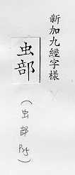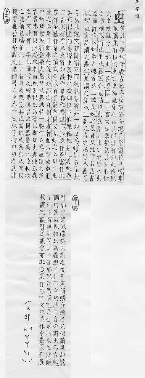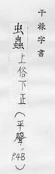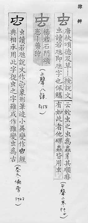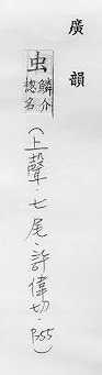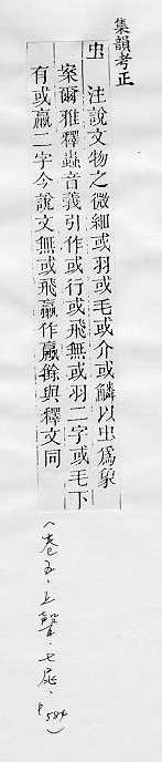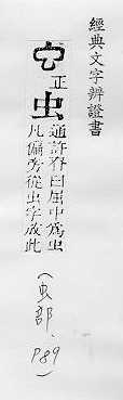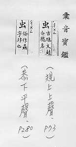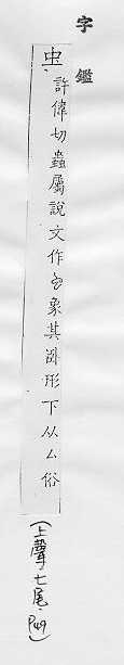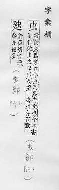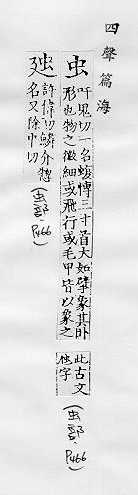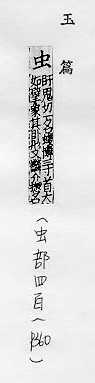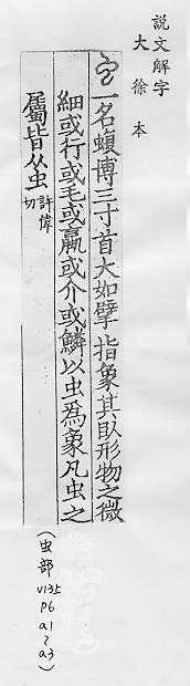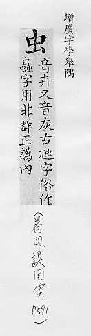 节肢动物的一类:昆~。益~。雕~小技(喻微不足道的技能)。 动物的通称:大~(老虎)。长~(蛇)。介~(有介壳的虫子)。