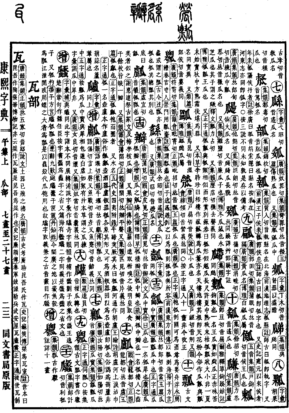 《唐韵》《集韵》《正韵》𠀤五寡切,音邷。《说文》土器已烧之总名。《广韵》古史考,夏时昆吾氏作瓦。《史记·龟箂传》桀为瓦室。《注》世本曰:昆吾作陶。张华博物记亦云:桀作瓦,盖是昆吾为桀作也。《史记·廉颇传》秦军鼓譟勒兵武安,屋瓦尽震。《正字通》后世瓦制不古,其类非一。汉武故事,起神屋以铜为瓦,漆其外。又吴国传,大秦国王宫殿水精为瓦。又明皇杂录,虢国夫人恩宠倾一时,夺韦嗣立宅,以广其居。后复归韦氏,因大风折屋,坠堂上,不损。视之,瓦皆坚木也。又王缙传:五台山祠铸铜为瓦,金涂之。 又《诗·小雅》载弄之瓦。《传》瓦,纺塼也。 又《仪礼·燕礼》公尊瓦大两。《注》大音泰。瓦大,有虞氏之尊也。 又《左传·昭二十六年》射之中楯瓦。《注》瓦,楯脊。 又瓦合。《礼·儒行》毁方而瓦合。《注》吕氏曰:陶者为瓦,必圆而割,分之则瓦,合之则圆,而不失其瓦之质。 又瓦解。《史记·匈奴传》其困败则瓦解云散矣。 又人名。《左传·昭二十三年》楚囊瓦为令尹。《注》囊瓦,子囊之孙子常也。 又地名。《春秋·隐八年》宋公齐侯衞侯盟于瓦屋。《注》瓦屋,周地。又《定八年》公会晋师于瓦。《注》瓦衞地。《后汉·郡国志》东郡有瓦亭。 又《广韵》五化切《集韵》吾化切,𠀤音迓。《广韵》泥瓦屋。《集韵》施瓦于屋也。 又《集韵》《韵会》𠀤五委切,音頠。屋甃也。《庄子·騈拇篇》騈于辩者,累瓦结䋲窜句。《注》瓦,五委反。当作丸。 又《韵补》叶阮古切,音五。《韩愈·元和圣德诗》皇帝俭勤,盥濯陶瓦。斥遣浮华,好此𫄨纻。