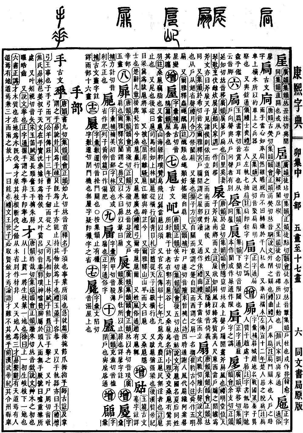 〔古文〕𡴱《唐韵》《正韵》侯古切《集韵》《韵会》后五切,𠀤音祜。《说文》有扈,国名。夏后同姓所封,战于甘者在鄠,有扈谷。 又桑扈,乌名。《诗·小雅》交交桑扈,有莺其羽。《注》桑扈,窃脂也。又当扈。《山海经·郭璞赞》鸟飞以翼,当扈以须。 又官名。《左传·昭十七年》九扈为九农正,扈民无淫者也。《注》扈,止也。 又尾也。后从曰扈。《司马相如·上林赋》扈从横行。《留靑日札》言随从天子,逐兽横行也。 又跋扈,犹强梁也。《后汉·质帝纪》目梁冀为跋扈将军。 又被也。《屈原·离骚》扈江离与辟芷兮。 又《尔雅·释山》山𤰞而大曰扈。 又桑扈,隐士也。《楚辞·九章》接舆髠首兮,桑扈臝行。 又扈扈,广也。《礼·檀弓》尔毋扈扈尔。 又姓。《风俗通》赵有扈辄。