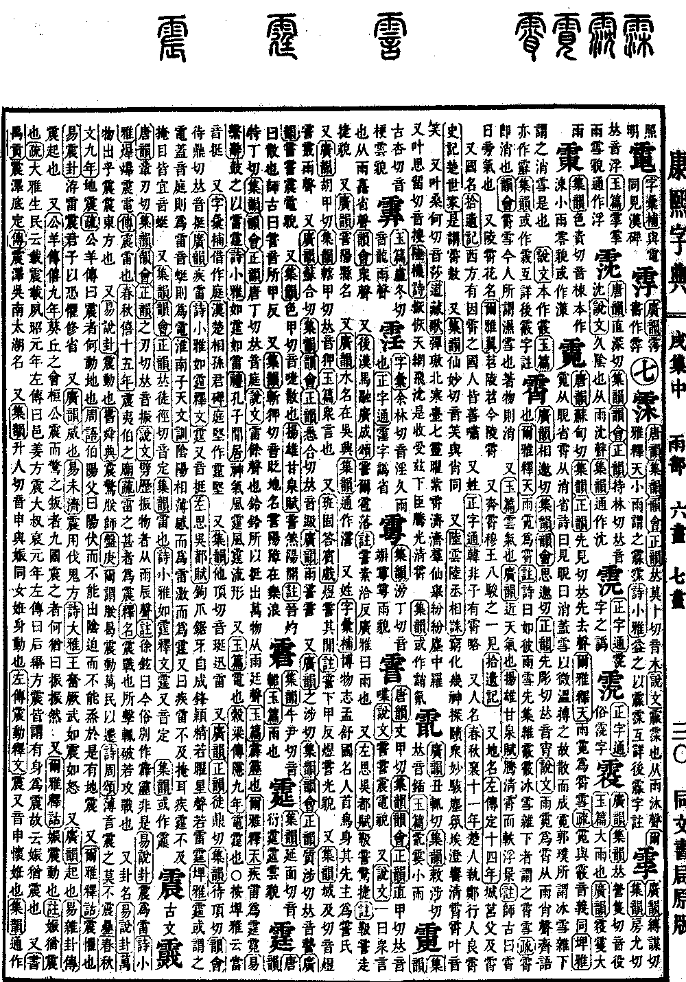 《广韵》相邀切《集韵》《韵会》思邀切《正韵》先彫切,𠀤音宵。《说文》雨䨘为霄雪。从雨肖声。齐语也。《尔雅·释天》雨䨘为霄。《注》诗曰:如彼雨雪,先集维霰。霰,冰雪杂下者,谓之霄雪。《疏》霄,即消也。《韵会》霄雪,今人所谓湿雪也。著物则消。 又《玉篇》云气也。《广韵》近天气也。《扬雄·甘泉赋》腾淸霄而轶浮景。《注》师古曰:霄,日旁气也。 又陵霄,花名。《尔雅翼》苕,陵苕,今陵霄。 又奔霄,𥡆王八骏之一。见《拾遗记》。 又地名。《左传·定十四年》城莒父及霄。 又国名。《拾遗记》西方有因霄之国,人皆善啸。 又姓。《正字通》韩非子有霄略。 又人名。《春秋·襄十一年》楚人执郑行人良霄。《史记·楚世家》是谓霄敖。 又《集韵》仙妙切,音笑。与肖同。 又《陆云·陆丞相诔》穷化几神,探赜众妙。骇尘氛埃,澄响淸霄。霄,叶音笑。 又叶桑何切,音莎。《道藏歌》弹璈北寒台,七灵曜紫霄。济济羣仙举,纷纷尘中罗。 又叶思留切,音搜。《陆机诗》恢恢天网,飞沈是收。受兹下臣,腾光淸霄。 《集韵》或作䨭㲵。*考证:〔《尔雅·释天》雨䨘为霄。〕 谨照原文为霄下增雪字。