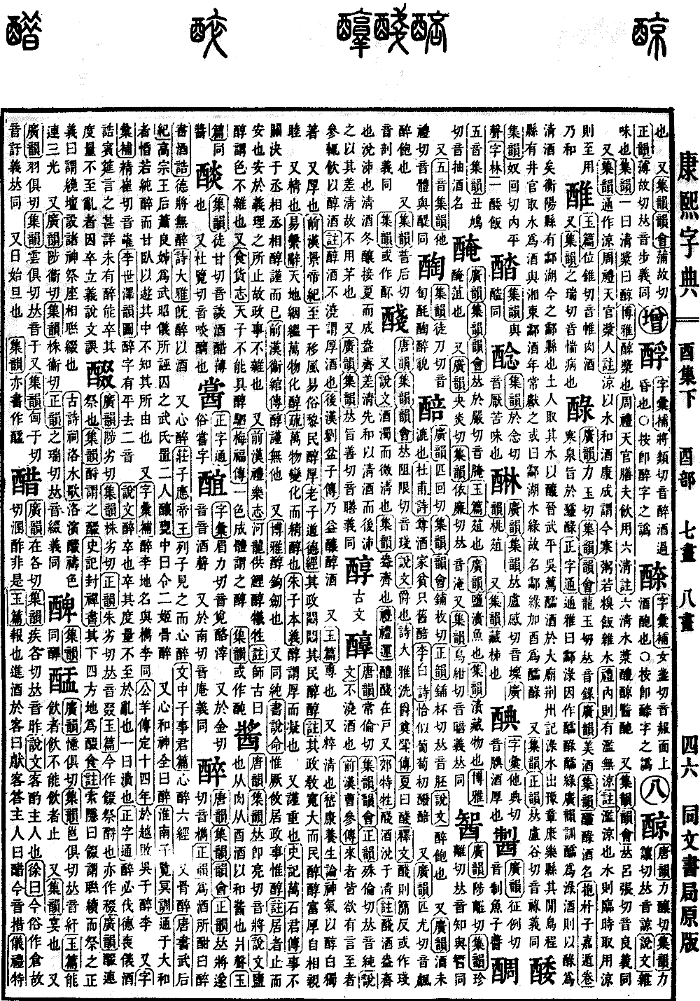 〔古文〕𨣳《唐韵》常伦切《集韵》《韵会》《正韵》殊伦切,𠀤音纯。《说文》不浇酒也。《前汉·曹参传》来者皆欲有言,至者参辄飮以醇酒。《注》醇酒不浇,谓厚酒也。《后汉·刘盆子传》乃益酿醇酒。 又《玉篇》专也。 又粹淸也。《嵆康·养生论》神气以醇白独着。 又厚也。《前汉·景帝纪》至于移风易俗,黎民醇厚。《老子·道德经》其政闷闷,其民醇醇。《注》其政敎宽大,而民醇醇富厚,自相亲睦。 又精也。《易·系辞》天地絪缊,万物化醇。《疏》万物变化而精醇也。《朱子·本义》醇谓厚而凝也。 又谨重也。《史记·万石君传》事不关决于丞相,丞相醇谨而已。《前汉·衞绾传》醇谨无他。 又《博雅》醇钩,劒也。 又同纯。《书·说命》惟厥攸居,政事惟醇。《注》居者,止而安也。安于义理之所止,故政事不杂也。 又《前汉·礼乐志》河龙供鲤醇牺牲。《注》师古曰:醇谓色不杂也。又《食货志》天子不能具醇驷。《梅福传》一色成体谓之醇。 《集韵》或作䣩。