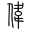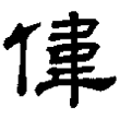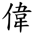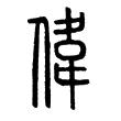 ,由「人」、「韋」二字構成。從人,示獨特、與一般人不同。從韋,聲符,注明音讀。隸書承自篆文,而中豎變形貫串到底。楷書分成三段,中段作口形,豎筆不貫串而定體。在六書中屬於形聲。