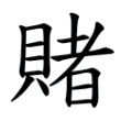 此字始見於篆文。篆文作從貝、者聲,在六書中屬於形聲。字見大徐本《說文》新附字:「賭,博簺也。」博,篆文作簙。《說文》:「簙,局戲也。六箸十二棋也。从竹、博聲。」段注:「經傳多假博字。」《說文》:「簺,行棋相塞謂之簺。从竹塞,塞亦聲。」賭字楷書字形因承篆文而來。