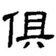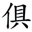 ,由「人」、「具」二字構成。從人,示眾人偕同之義。從具,聲符,注明音讀,兼表義。具,本義為具備,引申為齊全、偕同之義。金文「具」從貝,篆文「俱」所從「具」,從貝省。隸書承之,亦從貝省而省變橫筆。楷書承之,從貝省而豎筆延伸以成定體。在六書中屬於形聲兼會意。