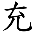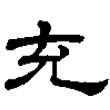 此字始見於篆文。篆文從倒子從儿。《說文》認為是「从儿,育省聲」,然古文字中?像倒子,並沒有獨立使用,亦不作聲符。《說文》省聲之說恐有可商。?在篆文有突出意,充字的長意恐是由?字來。在六書中屬於異文會意。