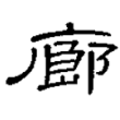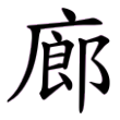 甲骨文廊字字形像古代穴居兩側的走道。金文字形承甲骨文而來。戰國文字則字形下半訛變為從亡,篆文字形承此而來。良的本義是廊道,由於空氣疏通,光線明亮,而引申為良好。良好之義取代廊道本義之後,轉注為「從邑、良聲」的「郎」字;郎字又假借為男子之稱與官名,而取代廊道本義,再轉注為「從广、郎聲」的「廊」字。篆文、隸書、楷書廊字即承此而來。在六書中屬於形聲兼會意。