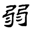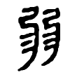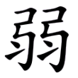 ,橈(ㄋㄠˊ)也。上象橈曲。彡象毛氂,橈弱也。弱物并,故从二?。」橈本指曲木,引申為「曲」。「?」字從弓、從彡,彎曲似弓,故取像於弓;柔弱似氂牛之毛,故取像於彡。直者多強,曲者多弱,因用彎曲以表柔弱,柔弱之物多並存而難以獨立,因此「弱」從二「?」,本義為曲木。在六書中屬於同文會意。
