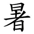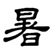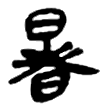此字始見於戰國文字,从日、者聲。在六書中屬於形聲。《說文》:「暑,熱也。」段注:「暑與熱渾言則一,故許以熱訓暑。析言則二。暑之義主謂溼,熱之義主謂燥,故溽暑謂溼暑也。《釋名》曰:『暑,煑也。如水煑物也。』」隸、楷字形均承戰國文字而來。